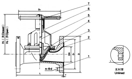 部件列表:1.閥體 2.閥體襯里 3.隔膜 4.閥瓣 5.閥桿 6.閥蓋 7、手輪