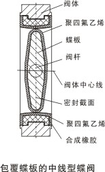 密封結(jié)構(gòu)采用聚四氟乙烯、合成橡膠和酚醛樹脂構(gòu)成復(fù)合閥座、使閥座在具有彈性的同時強度更好。同時將蝶板用聚四氟乙烯全包覆,使蝶板具有較強的抗腐蝕性能。