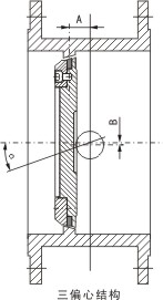 三偏心結(jié)構(gòu):閥桿軸線與蝶板密封面間偏置一個尺寸A,并與閥體通道軸線偏置一個尺寸B,閥座回轉(zhuǎn)軸線與閥體通道軸線形成一個偏心角α,故形成三偏心。蝶閥從0°~90°開啟時,蝶板密封面會在開啟的瞬間立即脫離閥座密封面,在其90°~0°關(guān)閉時,只有在關(guān)閉的瞬間,其蝶板圓錐形密封面才會接觸并壓緊閥座圓錐形密封。所以閥座與蝶板上的密封面之間無任何摩擦,去除了磨損和泄漏的可能性。