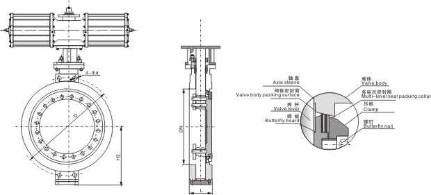 軟硬層疊式金屬密封結(jié)構(gòu):蝶板密封圈采用軟硬層疊式不銹鋼片和柔性石墨板的密封面,使其具有金屬硬密封和彈性密封的雙重優(yōu)點(diǎn),無(wú)論在低溫和高溫工況下均具有優(yōu)良的密封性能。