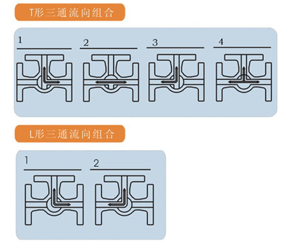固定式三通球閥采用固定球,彈簧或碟簧加載的四面閥座結(jié)構(gòu),密封可靠,開(kāi)關(guān)輕便。此結(jié)構(gòu)球體不同,有T形之分,其中T形可實(shí)現(xiàn)對(duì)介質(zhì)的分流或混流四種工況,根據(jù)需要可選擇其中兩種或三種進(jìn)行組合;L形可實(shí)現(xiàn)對(duì)介質(zhì)流向切換兩種工況。