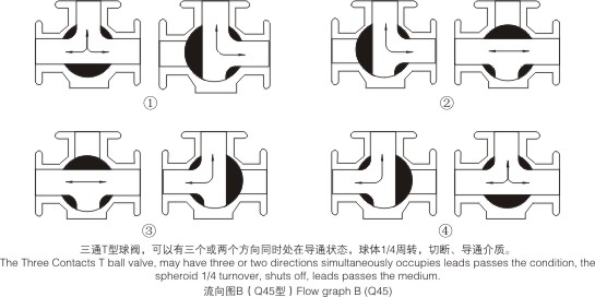 | 三通球閥一般采用兩閥座結(jié)構(gòu),如流向圖A所示兩種工況,選用兩閥座L型結(jié)構(gòu)(即Q44型)。流向圖B中①和④兩種工況亦可選用兩閥座T型結(jié)構(gòu)(即Q45型)。流向圖B中②和③兩種工況必須選用四閥座T型結(jié)構(gòu)(即Q45型)。其余工況也可選用四閥座結(jié)構(gòu),但應在訂貨合同中注明閥座結(jié)構(gòu)。 |